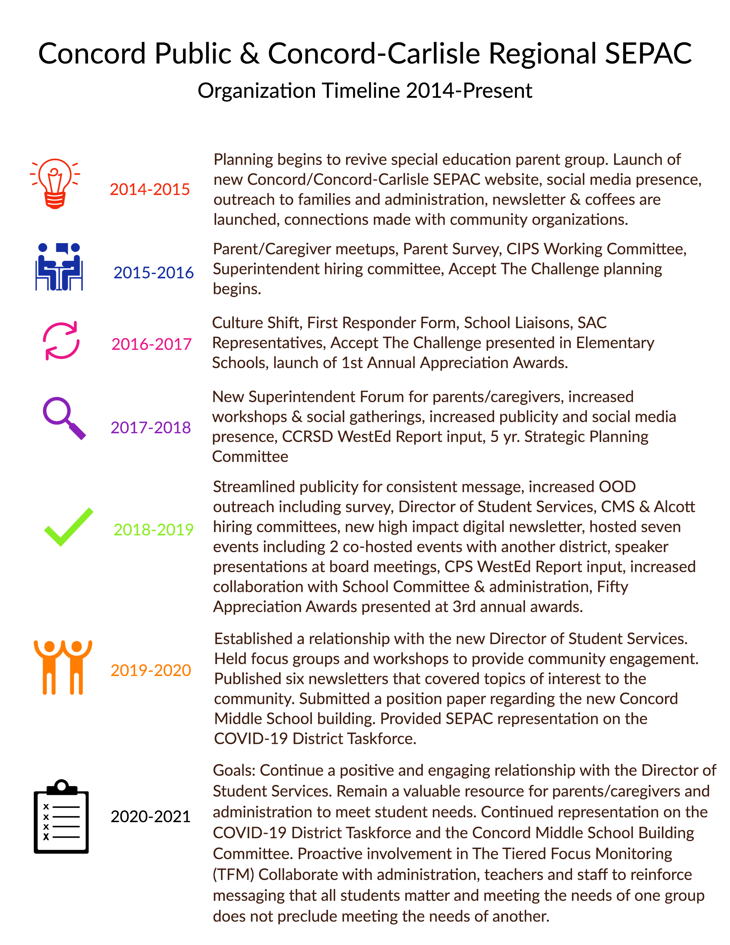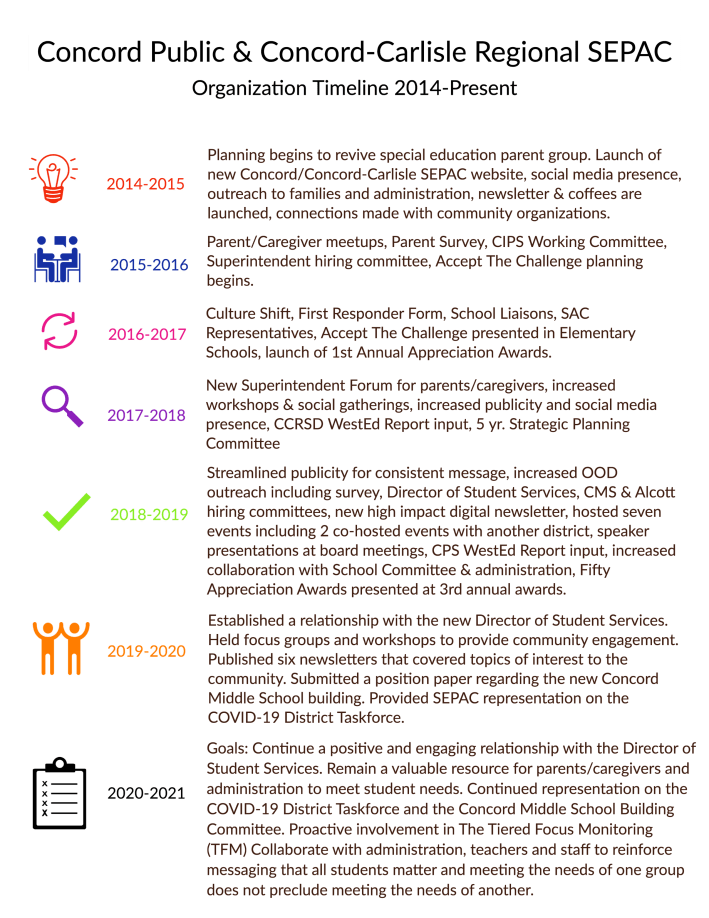 The mission of the Concord and Concord-Carlisle Regional School District Special Education Parent Advisory Council (SEPAC) is to ensure an appropriate education for children with disabilities and to foster and support a collaborative and inclusive culture in our schools and community that values diversity and recognizes the contributions and uniqueness of each learner. We promote and encourage an innovative educational environment which provides for equal access to student opportunities and education for students with disabilities and one where all students are encouraged to realize their full potential. We work in partnership with the school administration and the school committee to support students and further their goals of diversity, equity, and inclusion. We provide outreach, support, and education to inform and empower families and members of the community through events, workshops, and communication via newsletters, social media, and our website.